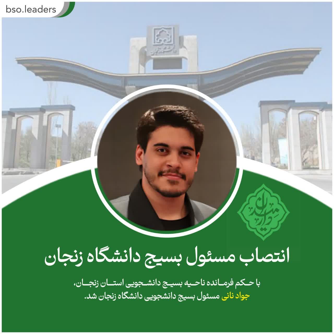 با حکم فرمانده ناحیه بسیج دانشجویی استان زنجان، جواد نانی مسئول بسیج دانشجویی دانشگاه زنجان شد.