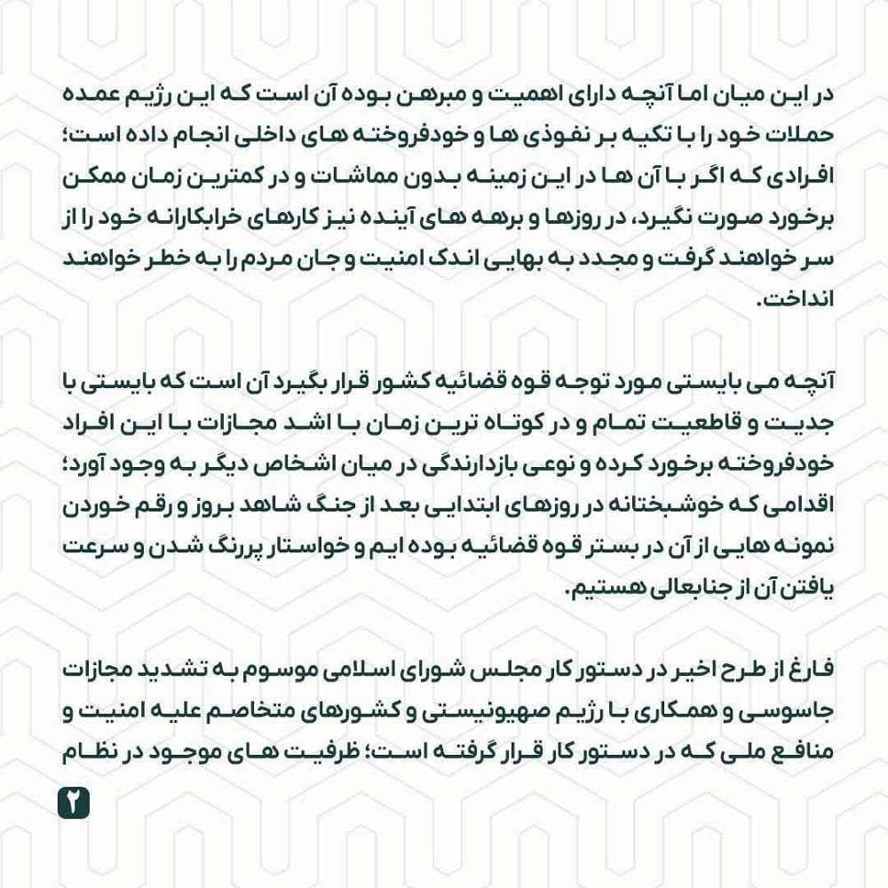 آنچه می بایستی مورد توجه قوه قضائیه کشور قرار بگیرد آن است که بایستی با جدیت و قاطعیت تمام و در کوتاه ترین زمان با اشد مجازات با این افراد خودفروخته برخورد کرده و نوعی بازدارندگی در میان اشخاص دیگر به وجود آورد؛ اقدامی که خوشبختانه در روزهای ابتدایی بعد از جنگ شاهد بروز و رقم خوردن نمونه هایی از آن در بستر قوه قضائیه بوده ایم و خواستار پررنگ شدن و سرعت یافتن آن از جنابعالی هستیم.