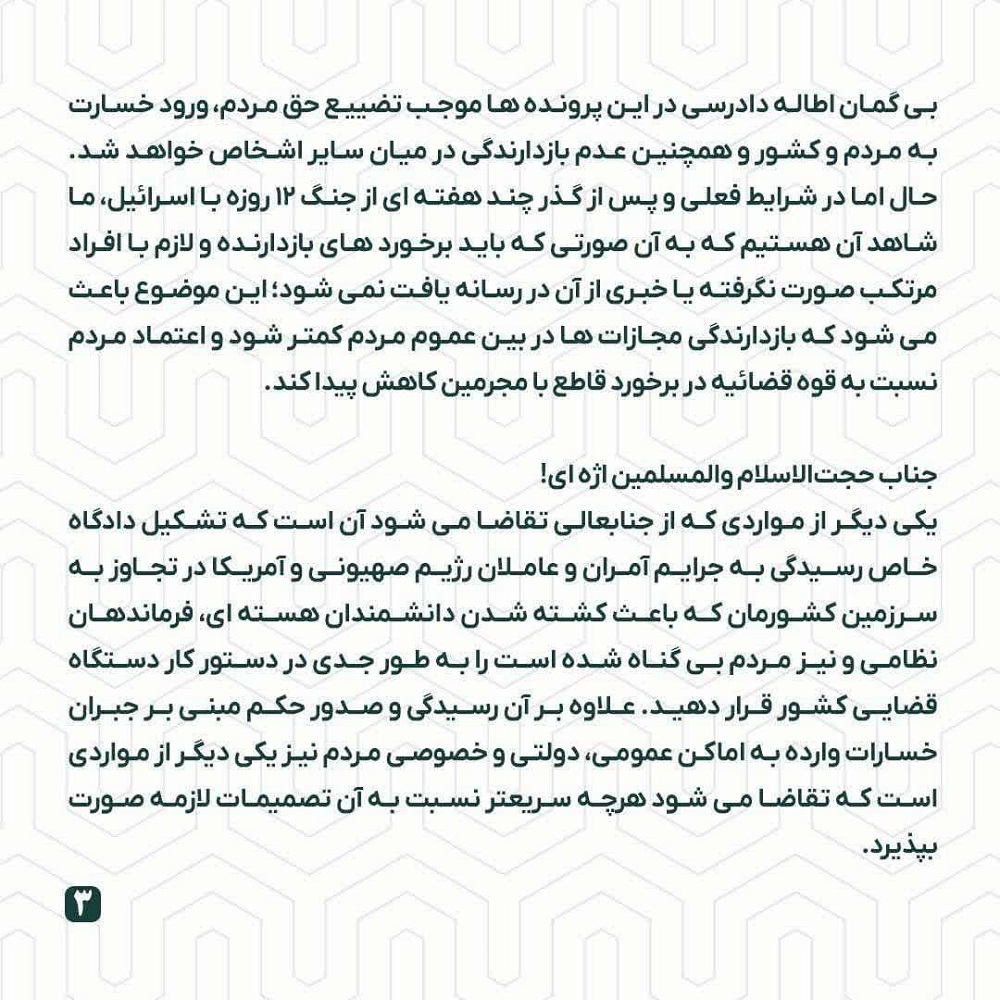 یکی دیگر از مواردی که از جنابعالی تقاضا می شود آن است که تشکیل دادگاه خاص رسیدگی به جرایم آمران و عاملان رژیم صهیونی و آمریکا در تجاوز به سرزمین کشورمان که باعث کشته شدن دانشمندان هسته ای، فرماندهان نظامی و نیز مردم بی گناه شده است را به طور جدی در دستور کار دستگاه قضایی کشور قرار دهید. علاوه بر آن رسیدگی و صدور حکم مبنی بر جبران خسارات وارده به اماکن عمومی، دولتی و خصوصی مردم نیز یکی دیگر از مواردی است که تقاضا می شود هرچه سریعتر نسبت به آن تصمیمات لازمه صورت بپذیرد.