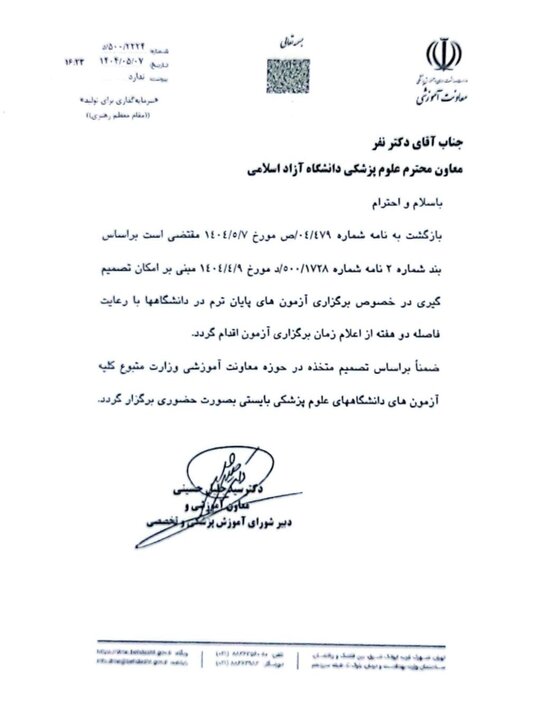 ضمناً بر اساس تصمیم متخذه در حوزه معاونت آموزشی وزارت متبوع کلیه آزمونهای دانشگاههای علوم پزشکی بایستی بصورت حضوری برگزار گردد.