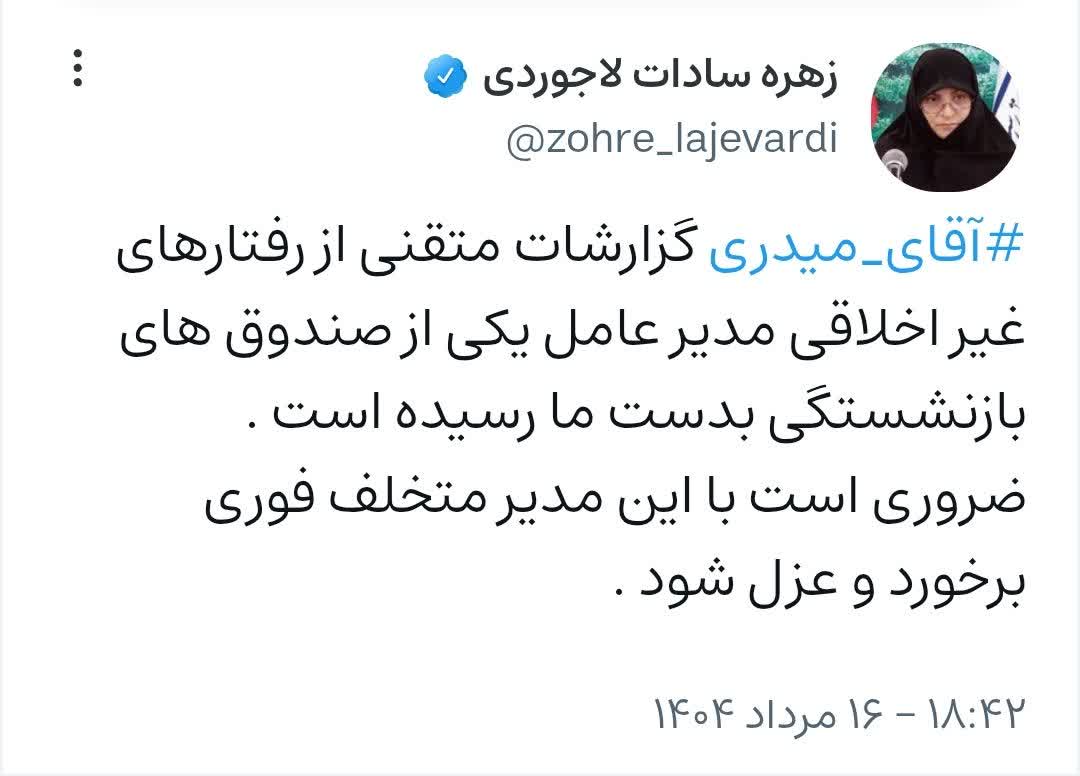 عضو هیأت رئیسه کمیسیون اجتماعی مجلس با انتشار تذکری در فضای مجازی، خواستار برخورد فوری و عزل مدیرعامل یکی از صندوق‌های بازنشستگی به دلیل گزارش‌های متقنی از رفتارهای غیر اخلاقی وی شد. زهره سادات لاجوردی تاکید کرد که رسیدگی به این تخلفات و حفظ اعتماد عمومی از اولویت‌های ضروری است.