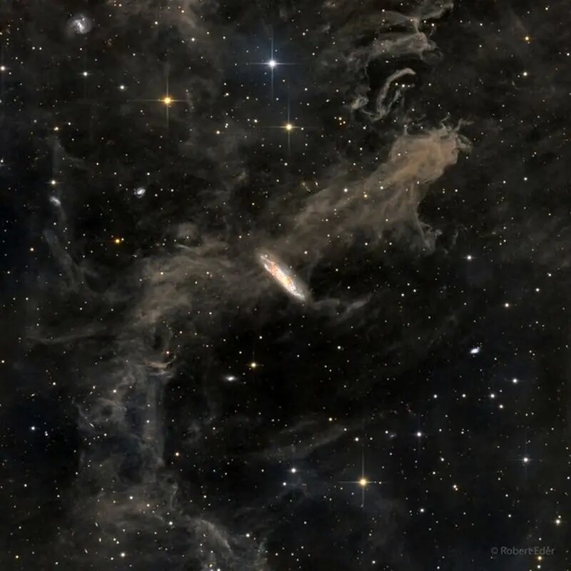 در میان این ابر غباری، کهکشانی مارپیچی و درخشان به نام «انجیسی 7497» دیده میشود که حدود ۶۰ میلیون سال نوری دورتر قرار دارد. این کهکشان که تقریباً از لبه دیده میشود، درست در مرکز تصویر جا خوش کرده و بازوهای مارپیچی و رگههای غباریاش شبیه به همان رنگها و ساختارهای ستاره و غبار در کهکشان خودمان جلوه میکند.