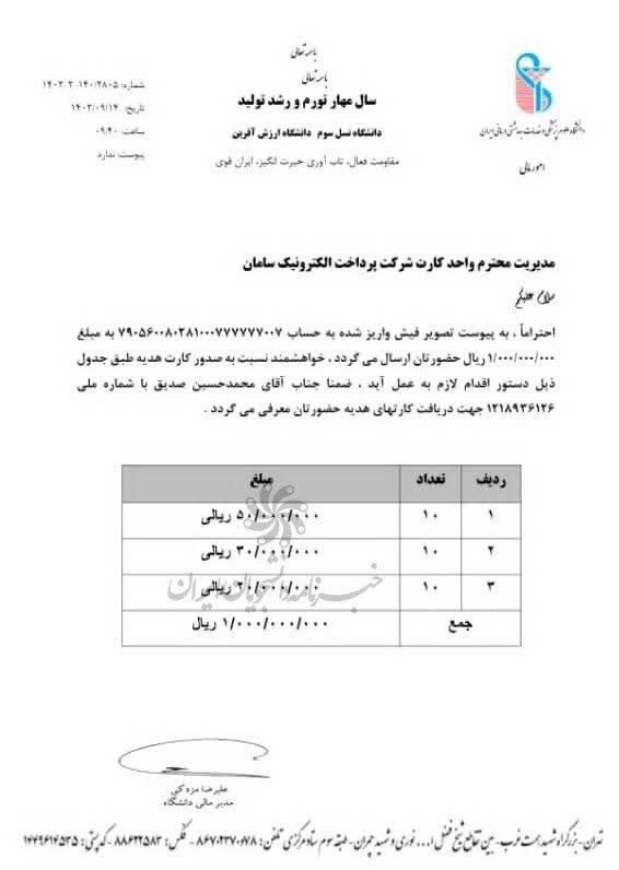 در اقدامی دیگر و در بازه زمانی مشابه، کارت‌های هدیه‌ای به ارزش ۴۱۹,۴۱۰,۰۰۰,۰۰۰ (چهارصد و نوزده میلیارد) ریال میان کارکنان و افراد خاص توزیع شده است. این پرداخت عظیم، نه تنها در دفاتر رسمی حسابداری دانشگاه ثبت نشده، بلکه آشکارا در تضاد با بخشنامه صریح خزانه‌داری کل کشور (شماره ۵۵/۱۴۱۰۶ مورخ ۳۰ دی ۱۴۰۲) عمل کرده است. اسناد برخی از کارت های هدیه در ادامه آماده است.