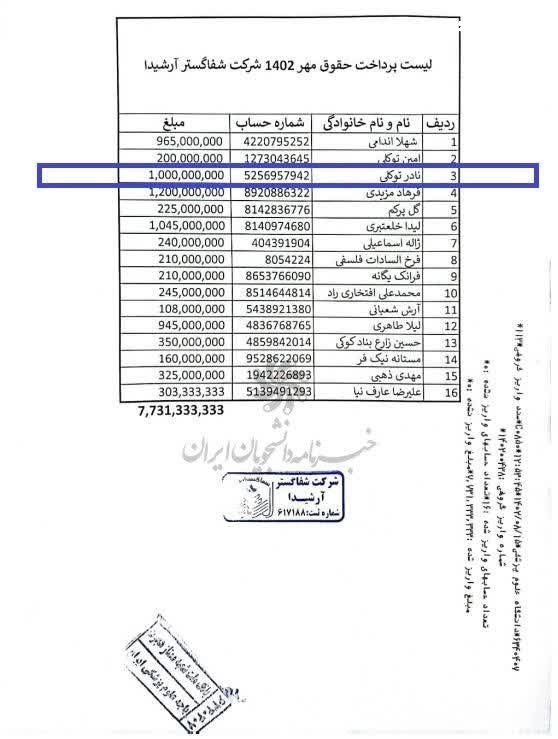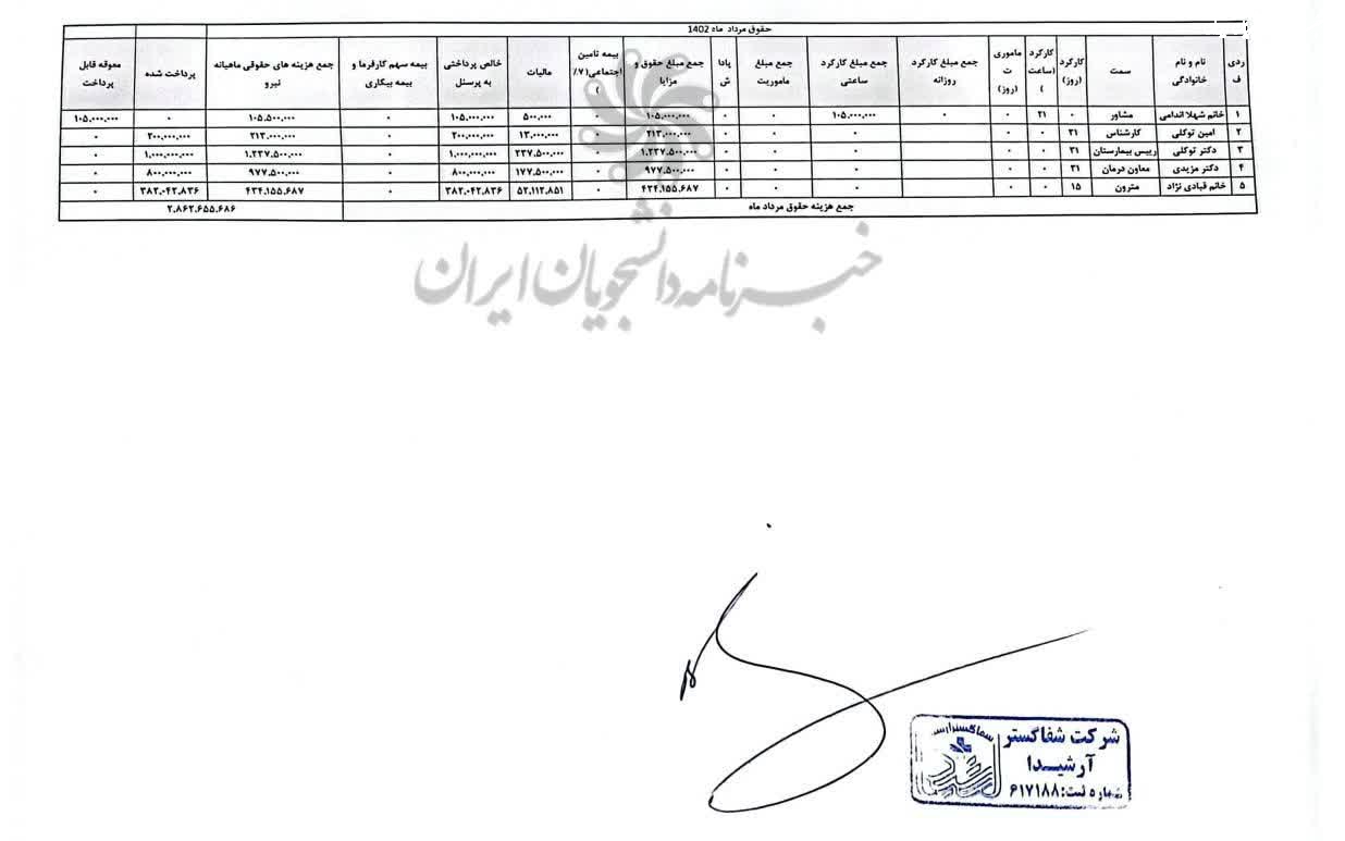 اسناد دیگری نشان می‌دهد «رئیس دانشگاه علوم پزشکی ایران» که به عنوان هیأت علمی تمام‌وقت جغرافیایی مشغول به فعالیت بوده، به صورت همزمان ماهانه مبلغ یک میلیارد ریال از شرکت «شفا گستر آرشیدا» حقوق دریافت می‌کرده است. این عمل، نقض آشکار قوانین و آیین‌نامه‌های استخدامی است که دریافت هم‌زمان حقوق از دو منبع را برای اعضای هیأت علمی تمام‌وقت مطلقاً ممنوع اعلام کرده است.