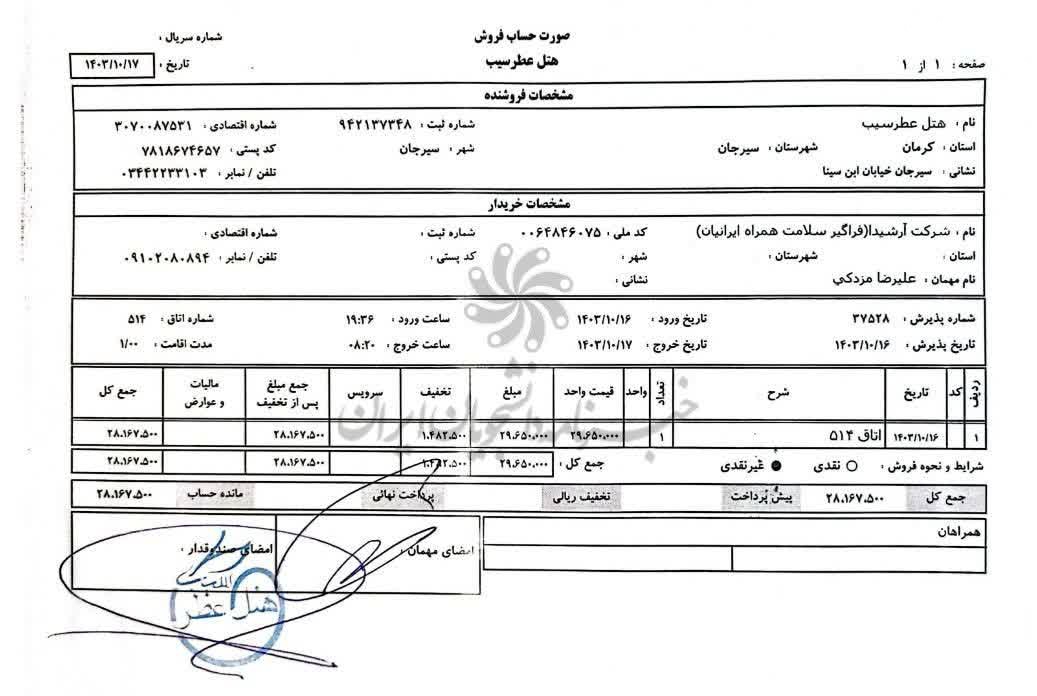 در اقدامی قابل تأمل و در زمان پیش‌فراخوان مناقصه، «مدیر مالی دانشگاه» و «مدیرعامل شرکت شفا گستر آرشیدا» در هتل «عطر سیب» اقامت مشترک داشته‌اند. صورتحساب این اقامت نیز به نام شرکت شفا گستر آرشیدا ثبت شده است.