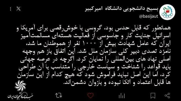 بسیج دانشجویی دانشگاه صنعتی امیرکبیر در واکنش به نامزدی رافائل گروسی برای تصدی دبیرکلی سازمان ملل، در بیانیه‌ای تند در شبکه اجتماعی ایکس، ضمن انتقاد از عملکرد نهادهای بین‌المللی، آن‌ها را «بازوان دشمن» توصیف کرد و تأکید نمود که اعتماد به چنین سازمان‌هایی خطایی راهبردی در سیاست خارجی است.