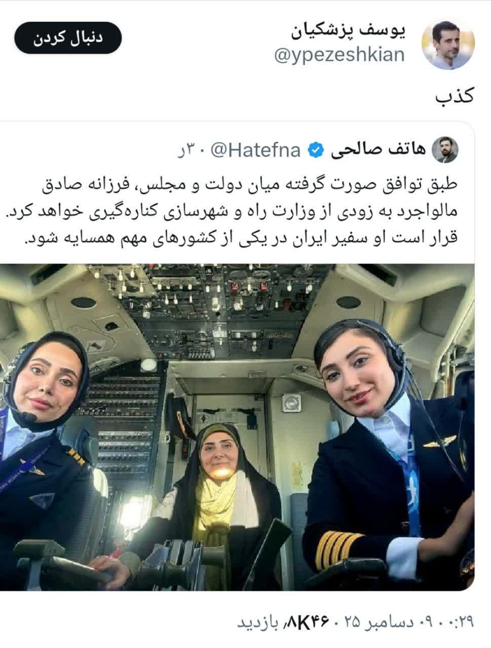 در این میان، یوسف پزشکیان، فرزند رئیس‌جمهور، در واکنش به یکی از توییت‌های هاتف صالحی که مدعی شده بود «فرزانه صادق مالواجرد، وزیر راه و شهرسازی، به‌زودی کناره گیری خواهد کرد»، صراحتاً اعلام کرده است که این ادعا «کذب» و نادرست است. با وجود این تکذیب، تاکنون اقدام مشخصی از سوی دولت یا نهادهای ذی‌ربط درباره برخورد با انتشار اخبار نادرست یا تعیین تکلیف وضعیت شغلی صالحی صورت نگرفته است.