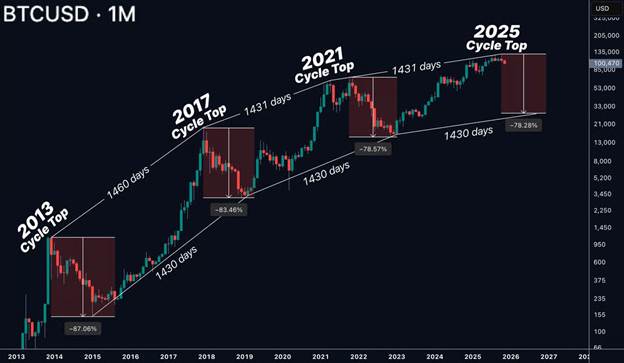 کاهش نوسانات علیرغم اصلاحات: اگرچه در اواخر سال 2025 اصلاحات قیمتی بزرگی رخ داد، اما نوسانات تحققیافته بسیار کمتر از سطحهایی بود که در نقاط چرخش چرخههای قبلی دیده میشد. این نشاندهنده آن است که بازار اکنون غالباً به دلیل مشارکت بیشتر نهادی، حرکات بزرگ را بهتر مدیریت میکند.
