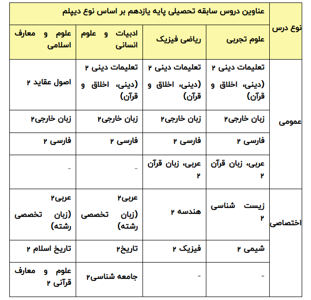 عناوین دروس سابقه تحصیلی پایه یازدهم برای هر یک از دیپلم ها در آزمون سراسری سال ۱۴۰۵ همانند آزمون سراسری سال ۱۴۰۴ به شرح جدول ذیل است: