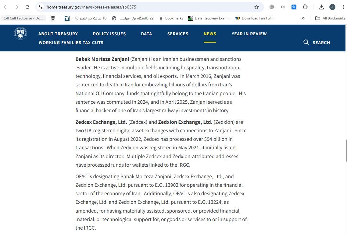 بر اساس این بیانیه، دفتر کنترل داراییهای خارجی وزارت خزانهداری ایالات متحده، بابک مرتضی زنجانی، Zedcex Exchange, Ltd و Zedxion Exchange, Ltd. را ذیل فرمان اجرایی ۱۳۹۰۲ به دلیل فعالیت در بخش مالی اقتصاد ایران تحریم کرده است.