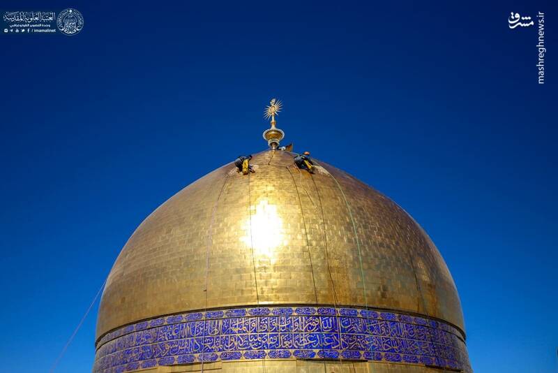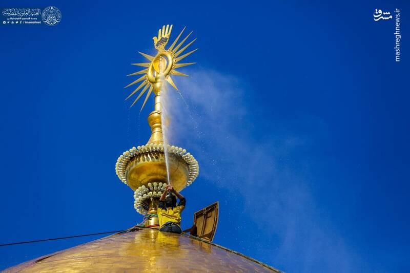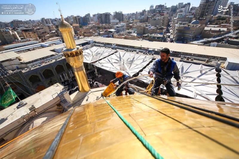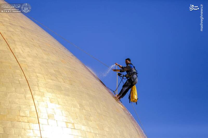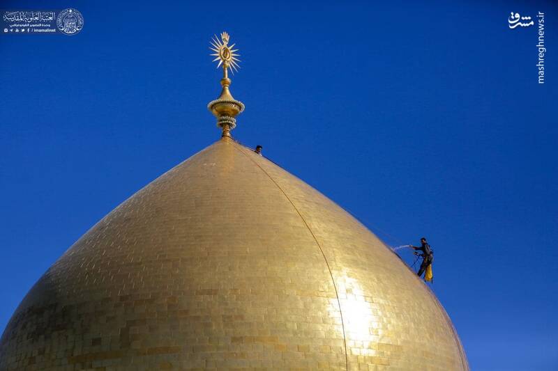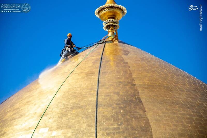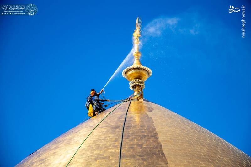 در آستانه ولادت با سعادت حضرت علی(ع) گنبد مطهر حرم علوی توسط خادمان حرم غبارروبی شد.